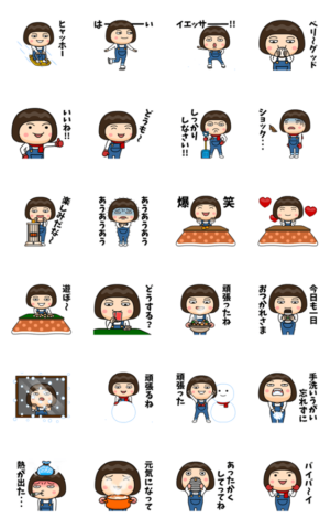 芋ジャージを脱ぎ捨て、オーバーオールに着替えた女の子。スケート、ソリ、雪だるま、コタツなど冬に使えるスタンプです。くーが より発売