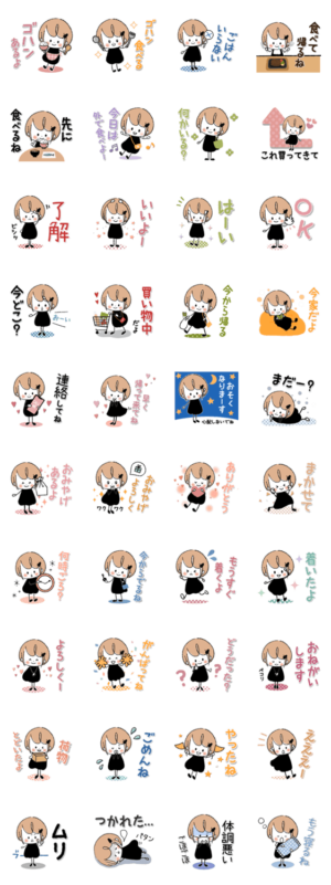 家族で使えるminiガールのスタンプです。メッセージが伝えやすいシンプルデザインにしました。ごはん/何時/帰る/いいよ/了解/OK/連絡/着いた/つかれた/もうねる