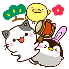 ペンギンキャラの『もちっペ』と、ひよこの『まるピヨ』、ぶち猫の『ちびブチ』の2023年用、新年スタンプ。卯年に合わせて、うさぎっぽい雰囲気のスタンプです。【修正版】 ※このスタンプはトークルームで大きく表示されるBIGスタンプです。かたこ より発売