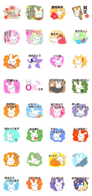 あけましておめでとうなど、お正月や普段の会話に使えるもちもちしたうさぎさんのスタンプです