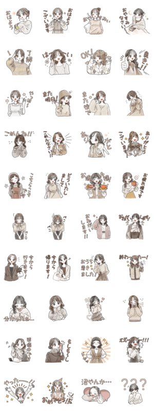 ふんわり可愛い淡色ファッションの女の子スタンプです♪日常会話多めで使いやすい♪お友達や彼氏、好きぴに!シンプル/ベージュ/ナチュラル/かわいい/オシャレ/挨拶/敬語