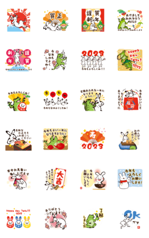 お正月に使える動く鳥獣戯画スタンプです。ゆる可愛いアニメのウサギやカエルが新年のご挨拶をいたします。お正月/丁寧/敬語/謹賀新年/年賀状/日常※2023/1/3(火)23:59までに購入すると特典「LINEおみくじ」がもらえます。三浦さくりーぬ より発売