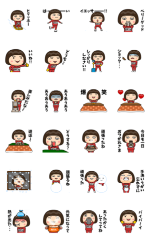 おばさん(オバサン)が使う芋ジャージスタンプ第27弾『冬編』。スケート、ソリ、雪だるま、コタツなど冬に使えるスタンプです。