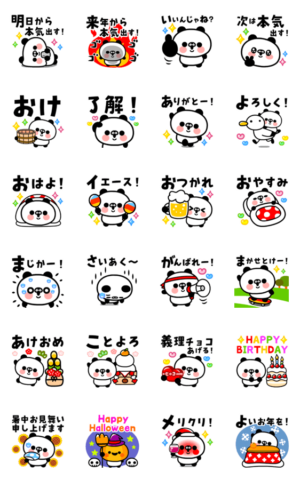 わんぱくパンダの年中使える飛び出すスタンプ!クリスマス、年末年始、バレンタイン、誕生日、暑中お見舞い、ハロウィンなどなど。普段使える挨拶や返事もそろってます!