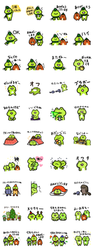 カエル好きのための、ほのぼのカエル「ぴーにゃ」のスタンプ第8弾です。冬に使いやすいスタンプをそろえました。かえる日和 より発売