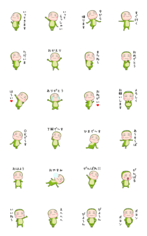 大人かわいいカッパ全身タイツちゃんのスタンプです。挨拶やお礼など日常よく使う言葉を集めました。家族や友達との連絡にどうぞ。