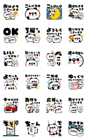 かわいいパンダとネズミのチューの年中使える敬語スタンプ♪毎日使える挨拶や返事がそろってます。かわいく飛び出すよ!