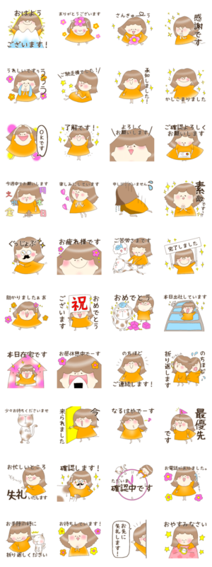 仕事で使えるスタンプです。おはよう、おやすみ、お疲れ様です、承知しました、かしこまりました、宜しお願いします、ありがとう、感謝です、申し訳ございません、確認中