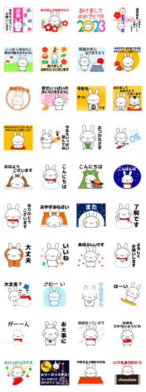 ウサギ(卯)年賀状、年賀の挨拶。大人かわいい。あけおめ。クリスマスや日常会話 敬語 ゆるいスタンプ。2023年 大きな文字で使いやすく見やすい。、正月、バレンタイン