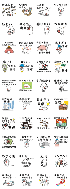 1月から12月までずーっと使える!やる気が出ないひよやんのスタンプです。花粉症/五月病/雨/雪/寒い/冬/春/夏/秋/暑い/台風/梅雨/正月/クリスマス/過去作のリメイク含む