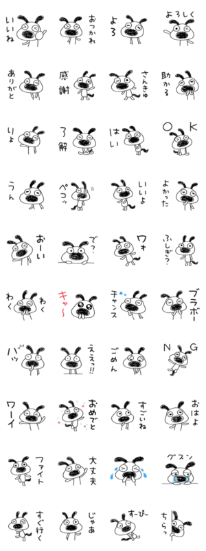 犬のバウピー。短め言葉編。「りょ」「ペコッ」から「さんきゅ」まで。スピーディーに気持ちを伝えやすいシンプルな言葉がいっぱい。家族、学校、お仕事でも。