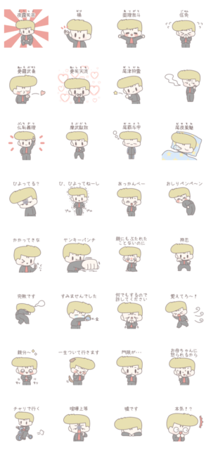 かわいいヤンキーの男の子スタンプです。関連用語:友達/かわいい/日常/家族/学生/高校生/中学生/大学生/リーゼント/金髪/不良/ひよってる/卍からしれんこ より発売