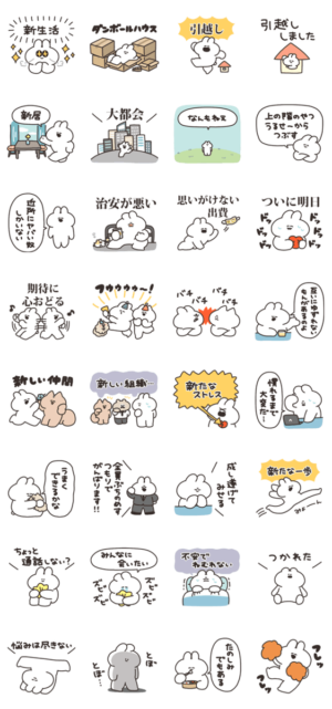 新生活をおくるうさぎのスタンプです。ナポリ より発売