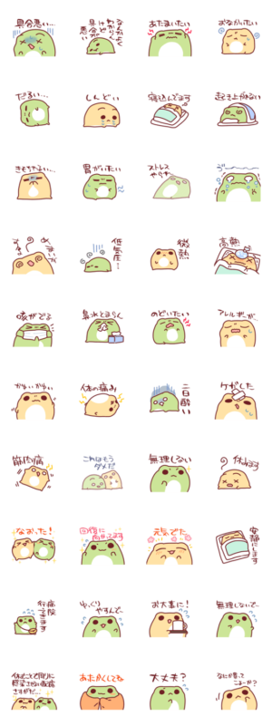 ころころとした大福のようなカエルのスタンプです。具合が悪いとき、体調を心配する時に使えるスタンプです。しろくろ より発売