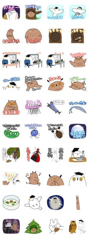 Youtubeチャンネル「進化生物学ch」のフクロウさんとミミズクさんのスタンプです。使いやすいスタンプから難易度の高いスタンプまで幅広く取り揃えています。