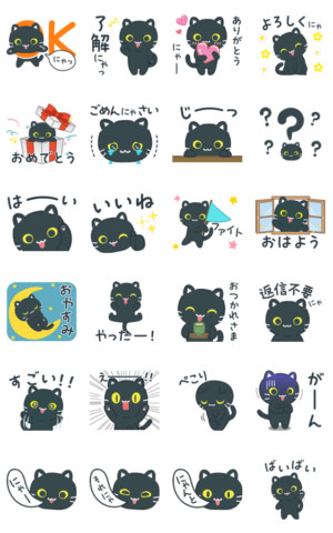 日常会話で使える!シンプルな黒猫のキャラクターの使いやすい画面いっぱいに飛び出す滑らかに動くスタンプです。