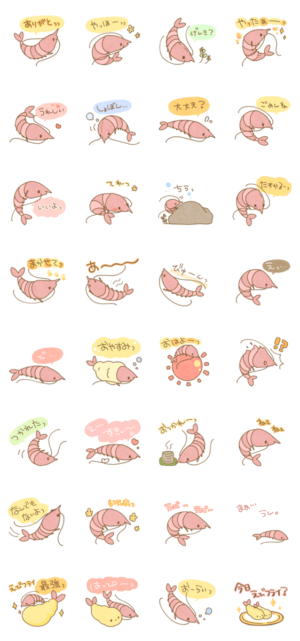 元気な海老のえびちゃんスタンプ!基本的には元気だけど、たま落ち込むことだってあるよね。そんな使い勝手抜群スタンプ。あとエビフライ最強!るぴ より発売