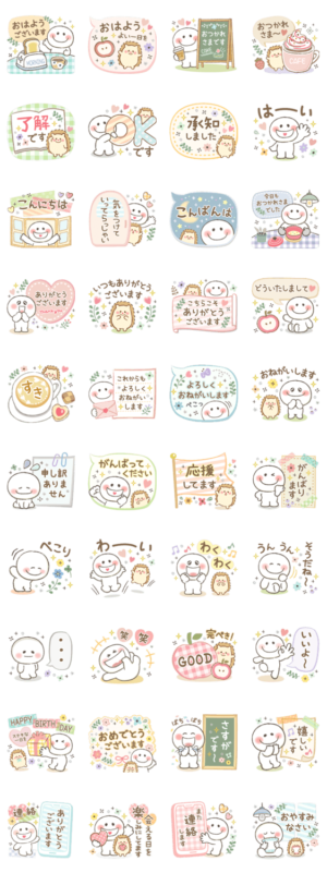 毎日ふんわりやさしい気持ち伝えよう♥はりねずみと白スマイルのふんわりやさしいスタンプ♪付箋風/北欧風/敬語/お祝い/誕生日/くすみ/吹き出し/マスキングテープ/カフェ風