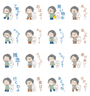 おしゃれなおばあちゃんと、仲良しうさぎのステッカーです。hirame より発売