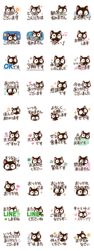 『小さい黒猫スタンプ』の北欧風で、敬語や丁寧な言葉多めの、優しいクロネコスタンプです。くろねこ好きな方にぜひ。絵文字も着せかえもあります。【かたこ】かたこ より発売
