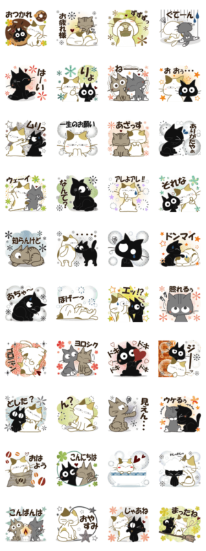 黒ねこちゃん達とみけさんのコラボスタンプ4つ目!ゆる~い相づち・リアクションスタンプです♥まちゃの部屋 より発売