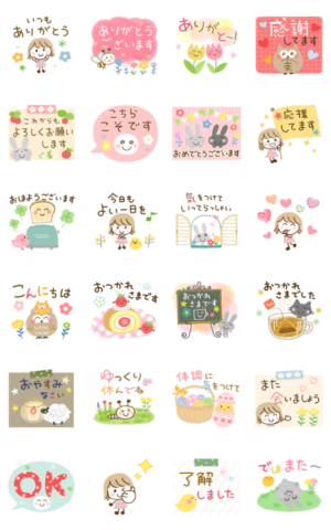 ふんわりしたやさしい色あいの挨拶スタンプです。 春からずっと使えます。 ひらりーーの大人の気遣いシリーズ20 女の子/挨拶/敬語/うさぎ/ふくろう/猫/新生活ひらりーー より発売