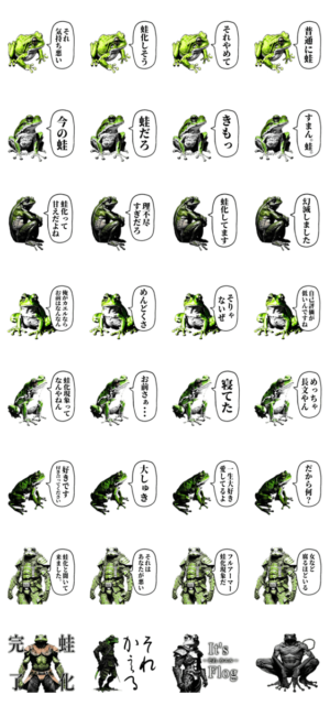【怖い/煽り/インパクト/カエル/生き物/便利/むかつく/糞/クズ/女/恋愛/AI/シュール/言い訳/何様/返事/日常/財布/割り勘/気持ち悪い/キモい/筋肉/マッチョ/騎士/その他】ヤバいスタンプ屋さん より発売