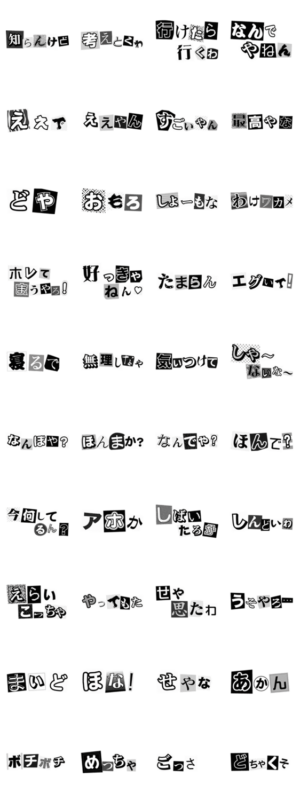 文字を切り貼りして作った脅迫状風、犯行声明風のスタンプ。省スペーススタンプなので使いやすく、組み合わせて文章を作ることもできます。※関西弁/大阪弁特化バージョン