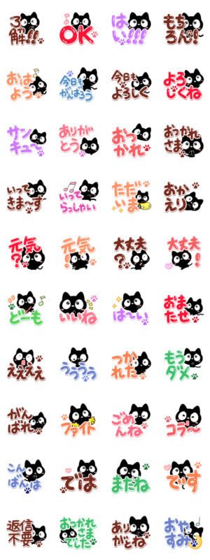 『クロネコすたんぷ』の絵文字と着せかえもあります!カラフルで大きな文字の、可愛い、くろねこスタンプ。大きく選びやすい黒猫スタンプです。【かたこ】
