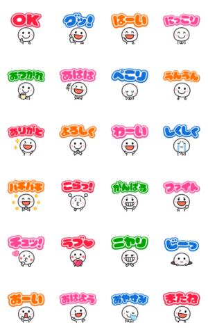 ハッキリわかりやすい大きな文字の動くスタンプ。カラフル・ポップで楽しくかわいい。よく使う言葉を中心に集め、シンプルで毎日使えるスタンプになってます。