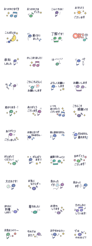 シンプルで文字が大きく、敬語で使いやすい音符キャラクターのスタンプです。楽団の練習や楽器レッスンの連絡などなど…音楽に携わる方にたくさん使っていただきたいです♪