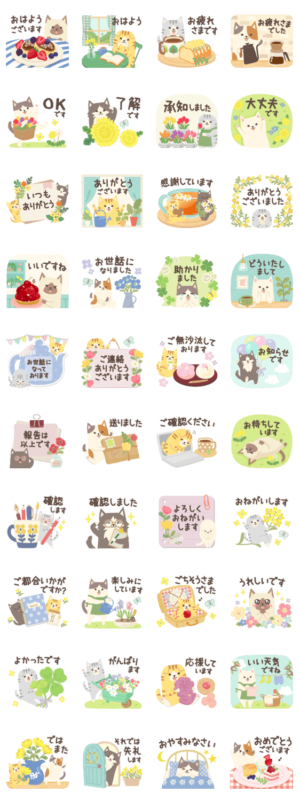 甘さ控えめ大人女子向け猫♪春の毎日あいさつに使えるねこスタンプ。新生活・日常の丁寧な気づかい言葉、敬語でお仕事にも♪ママ友、 家族、カップル、挨拶、スイーツ