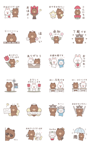 LINEフレンズとくまのおうちのコラボ第18弾。毎日使える♪敬語あり♪春にぴったり、やさしい色合いが可愛いスタンプです。 ※BROWN & FRIENDS をみんなでつくろう!キャンペーン参加スタンプですtttan. (てぃてぃたん) より発売