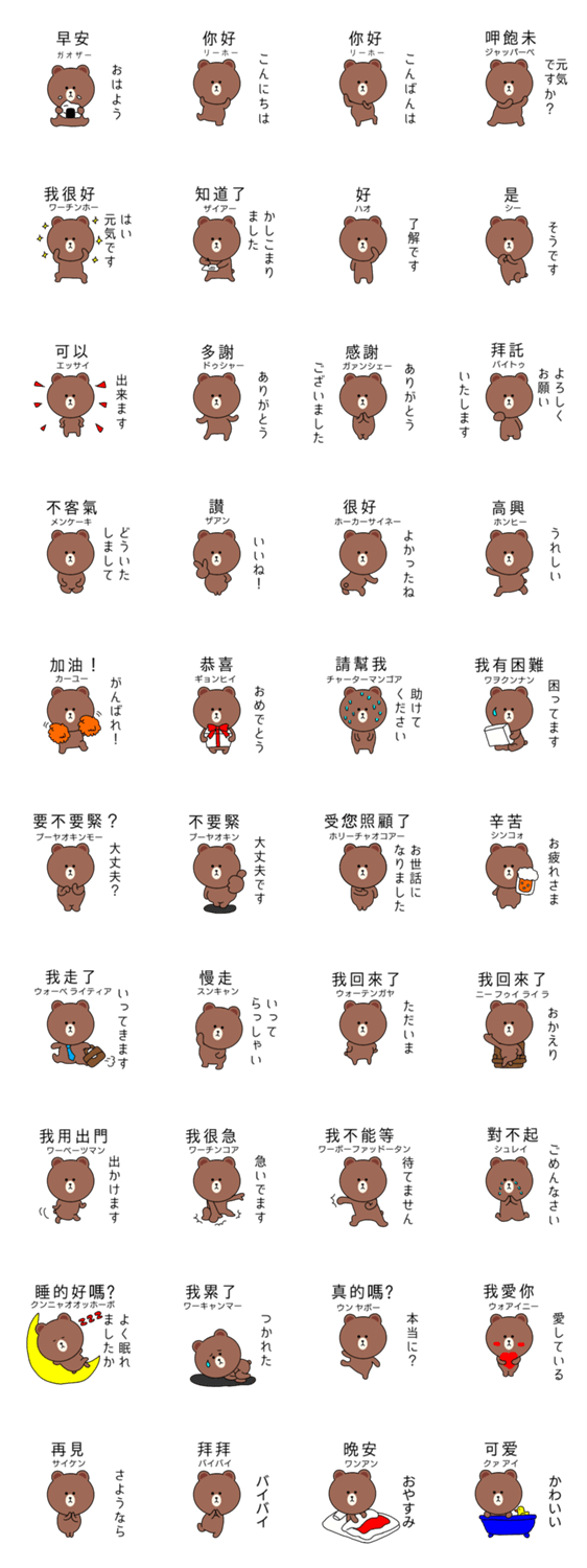 中国語(台湾語)日本語ブラウン連絡スタンプのダウンロードはこちら↓