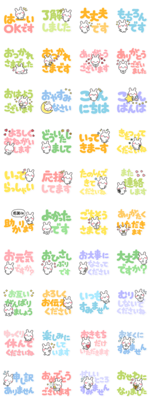 うさぎさんのデカ文字スタンプです。文字が大きいので選びやすく見やすいスタンプで、毎日使える内容を厳選し作成しました。【作:いしいともこ】