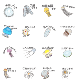 加茂水族館の公式LINEスタンプです。16種類のクラゲたちがスタンプになりました。鶴岡市立加茂水族館 より発売