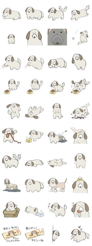 Web上の野良犬・ふわんわんのスタンプ第一弾のテイストを最近のものに合わせ、全て描き直しました。最後までイヌ度たっぷり!あらたアトリ より発売