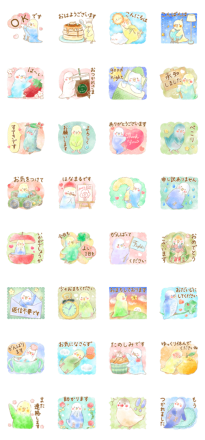 色んなインコちゃんたちの丁寧・敬語スタンプになっています。様々な場面で使いやすい台詞を集めました。水彩でふんわりキュートな雰囲気になっています。
