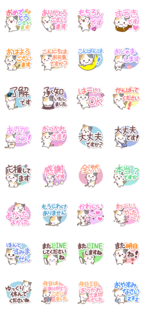 『お茶目な三毛猫』の、毎日使える、みけねこスタンプです。ずっと使えて便利なスタンプ。ミケネコ好きな方にぜひ。【かたこ】あいさつ/お仕事/学校/ママ友/かわいいかたこ より発売