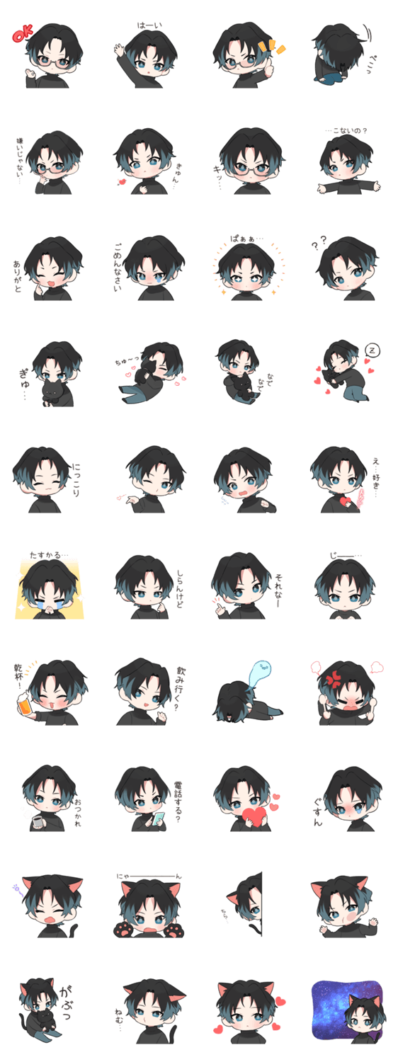 赤面や猫耳姿が可愛い♡照れ屋で強気なセンターパートの男の子のほのぼのスタンプです!女の子版とペアで使えます!リアクションや愛情表現多めで恋人や友達、大切な人へ♪