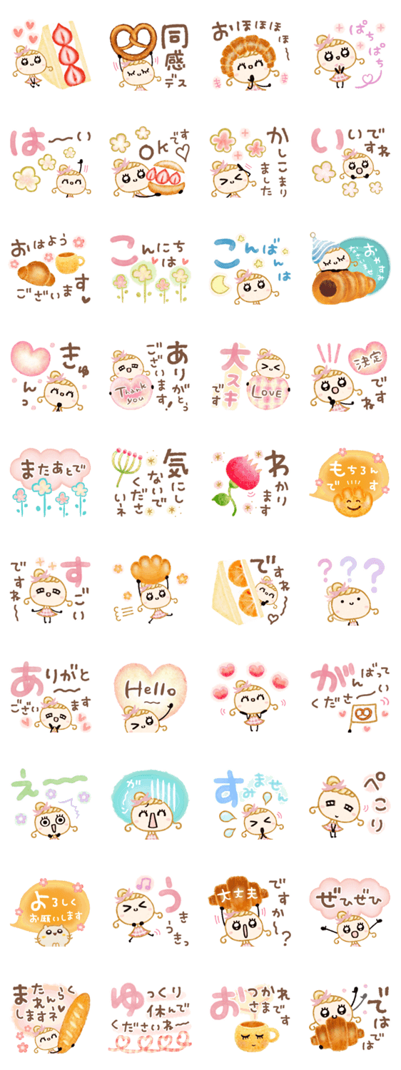 ぷくぷくほっぺのほぺ美ちゃん◎美味しそうなパンがたくさん登場♡ハッピーな気持ちで使える敬語スタンプです♪小さな幸せ/感謝あさごぱん より発売