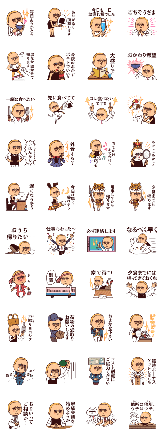 食事、家事、相談、頼み事…事務的になりがちな家族や夫婦間の連絡をシュールで楽しく。①号と併せて使える、毎日そこそこ役に立つ、便利な家族連絡用LINEスタンプ第二弾。