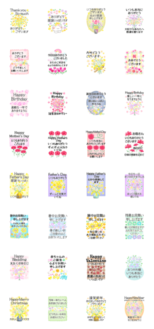 ちょっと大きめBIGスタンプ。母の日、父の日、年末年始や誕生日、ご結婚やご出産、日頃の感謝やお祝いを花いっぱいのメッセージカードに。(お礼状/季節のご挨拶/年賀状) ※このスタンプはトークルームで大きく表示されるBIGスタンプです。Konko3 より発売