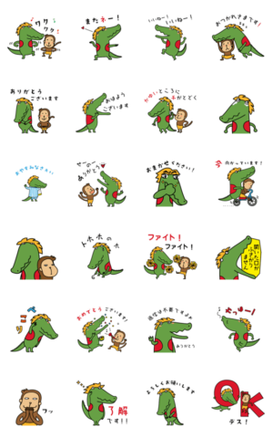 絵本「あたまにけがはえたワニ」の主人公ワニのランディと、仲間のおさるのサールがLINEの会話に登場するよ♪