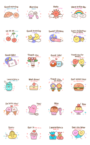 使いやすい敬語の「英語&日本語版」アニメーションです♪ 飲み物や食べ物、植物や身の回りグッズなどをモチーフにした可愛いスタンプですよ〜♬