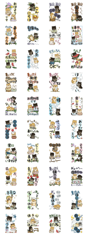 柴犬・茶色い犬のちゃちゃ丸とその仲間たちの初夏に使えそうなスタンプです。