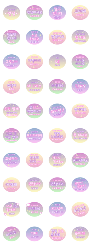 ネオンサイン風のハングルスタンプです。 日常のあいさつと優しくて思いやりの言葉を集めました。mochi より発売