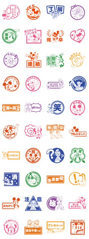 ミッキー&フレンズの、ちょっぴりリアルなハンコ風スタンプ登場!プライベートでもお仕事でも気軽にポン!と送りやすいデザインです。