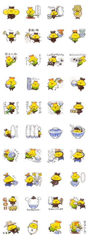 ゆるい天ぷらの忍者と侍の、お米にまつわるスタンプです。もりもりお米はテンプラと相性抜群。シノザキ より発売