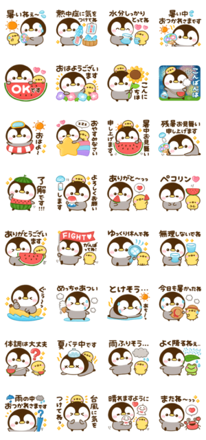 夏に役立つ言葉や動きがいっぱい♡相手を思いやる言葉も入ったぺんぺんのスタンプセットです。 ペンギン/夏/天気ぴよたぬき♡ より発売